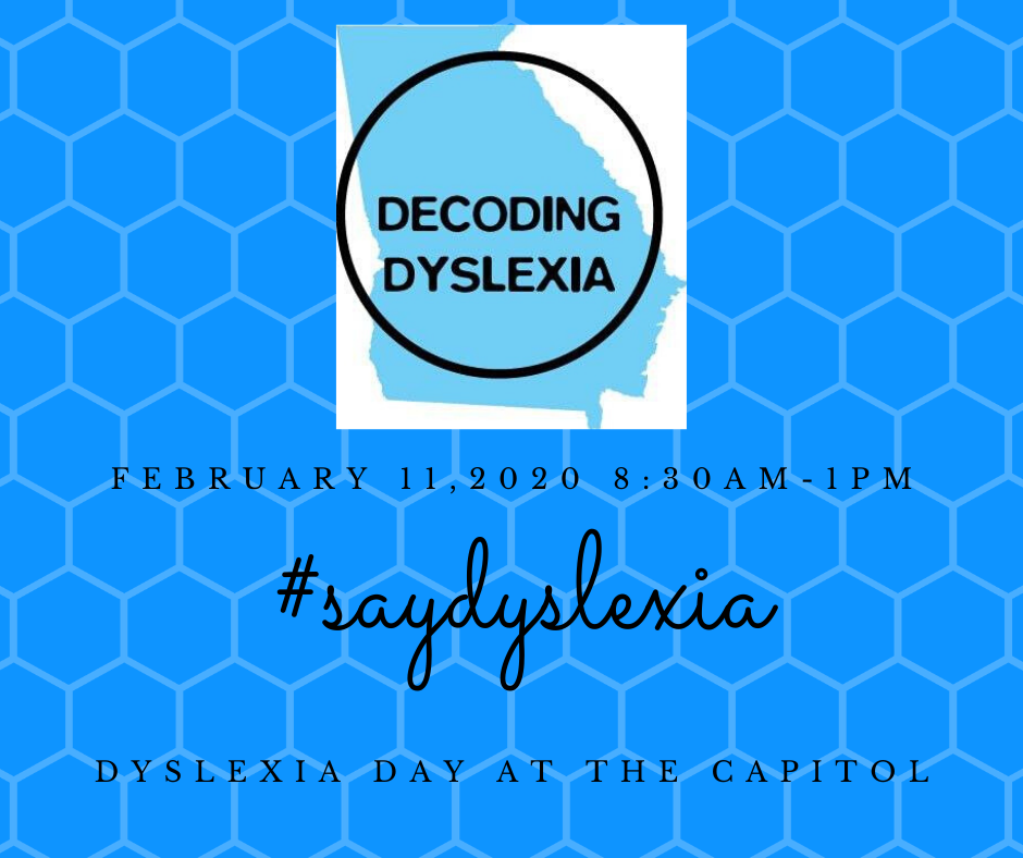 Representatives from Decoding Dyslexia GA, International Dyslexia Association GA, and other Community Partners will gather in Capitol Room 230 from 8:30 am-1:00 pm. Volunteers from Decoding Dyslexia GA are also organizing a lineup of events.