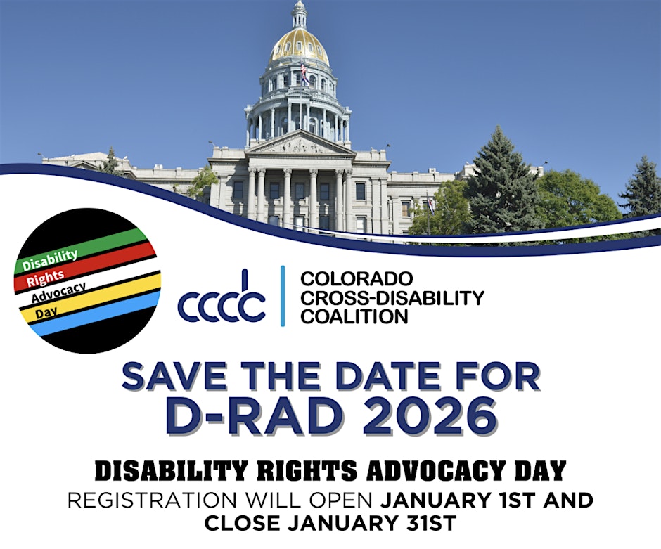 [Image description: Underneath a photo of the Colorado State Capitol, a colorful graphic says Disability Rights Advocacy Day. Next to it, the logo and name of Colorado Cross-Disability Coalition. Below, text says "Save the date for D-RAD 2026. Disability Rights Advocacy Day. Registration will open January first and close January thirty first."]