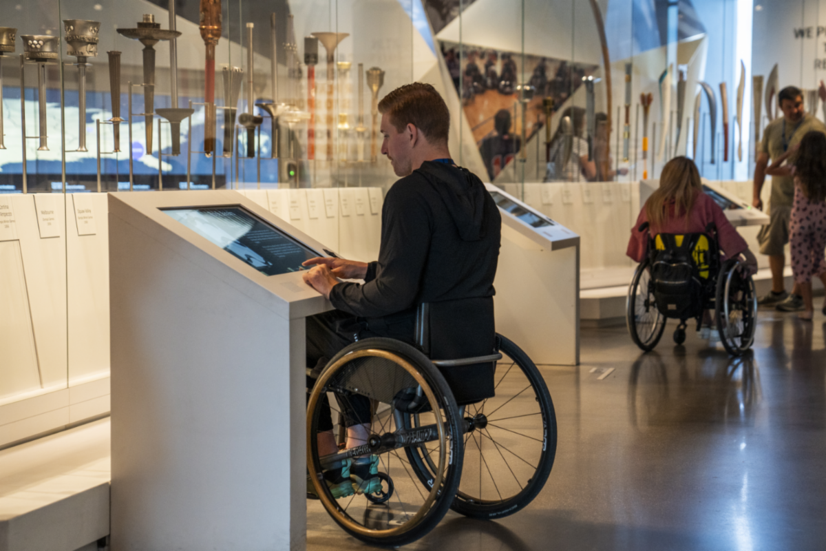 [Image description: A person in a wheelchair looks at a display at the US Olympic & Paralympic Museum front of a display case full of various torches. Photo provided by Visit COS.]