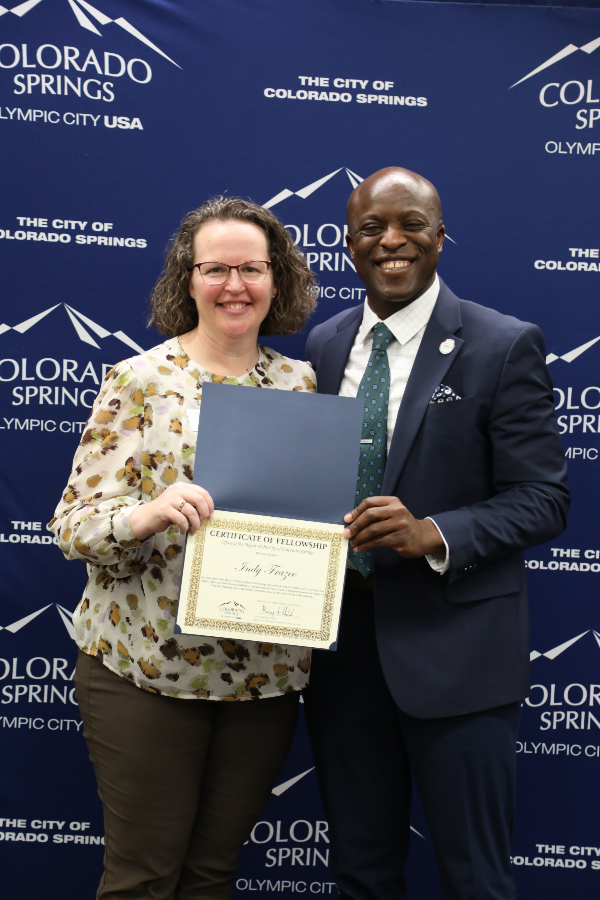 [Image description: The IC's CEO Indy Frazee smiles for the camera holding up a Certificate of Fellowship. Also holding the certificate is Colorado Springs Mayor Yemi Mobolade. He is smiling and wears a blue suit with a green tie.]