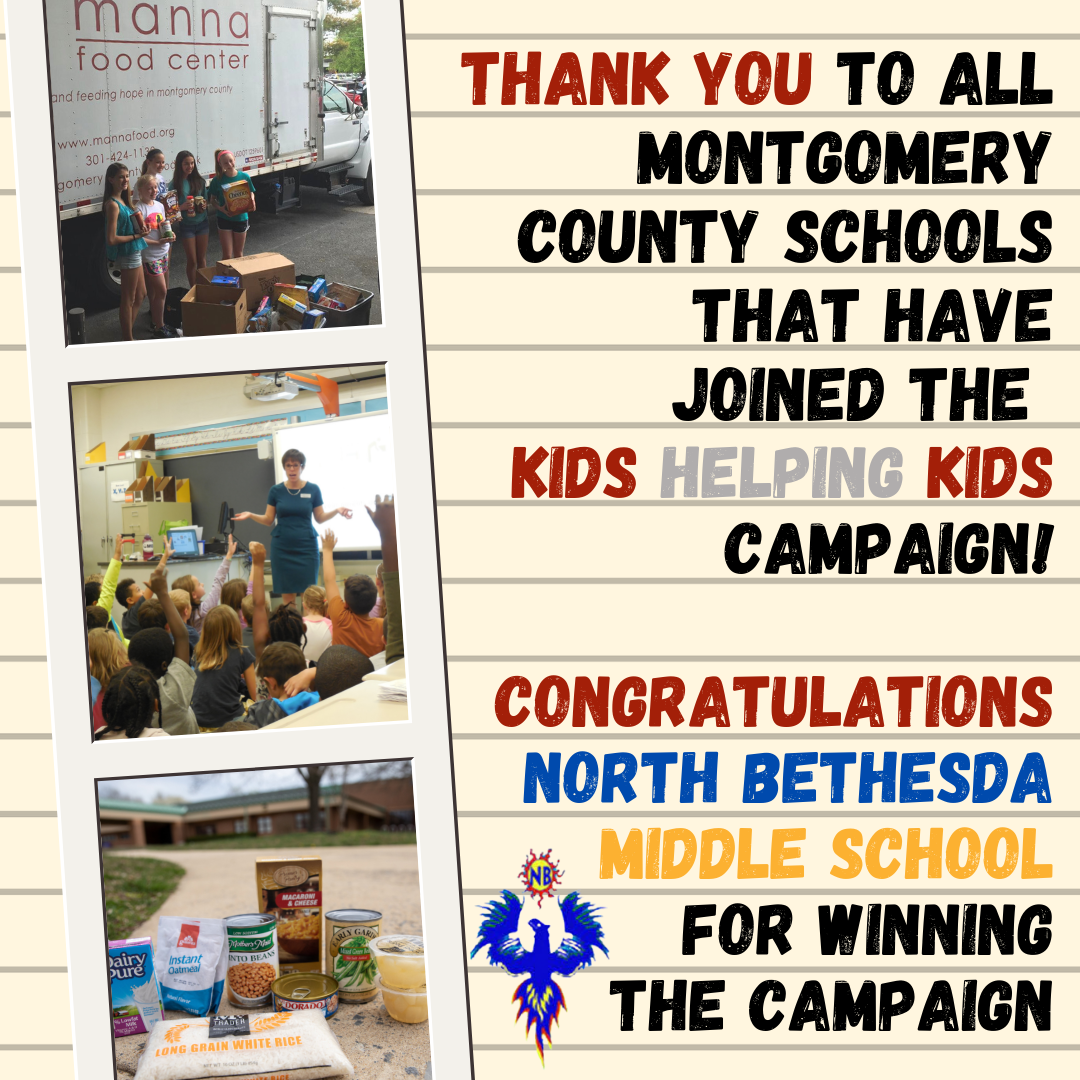 We also want to congratulate North Bethesda Middle School for winning the Kids Helping Kids campaign this year by providing 3,116 lbs of food. We are honored to present your school with this award and grateful for your spirit of generosity.