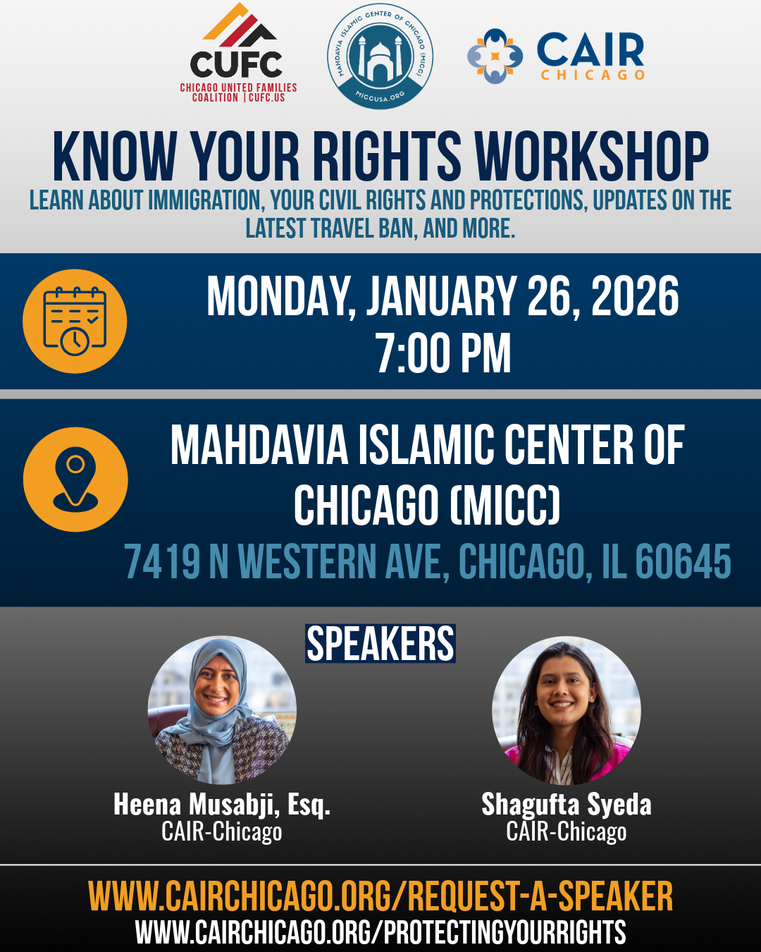 CAIR-Chicago and the Muslim Bar Association of Chicago are offering Know Your Rights Presentations to help Chicagoland mosques, community centers, Islamic schools, and businesses understand how to respond to ICE and protect their communities.