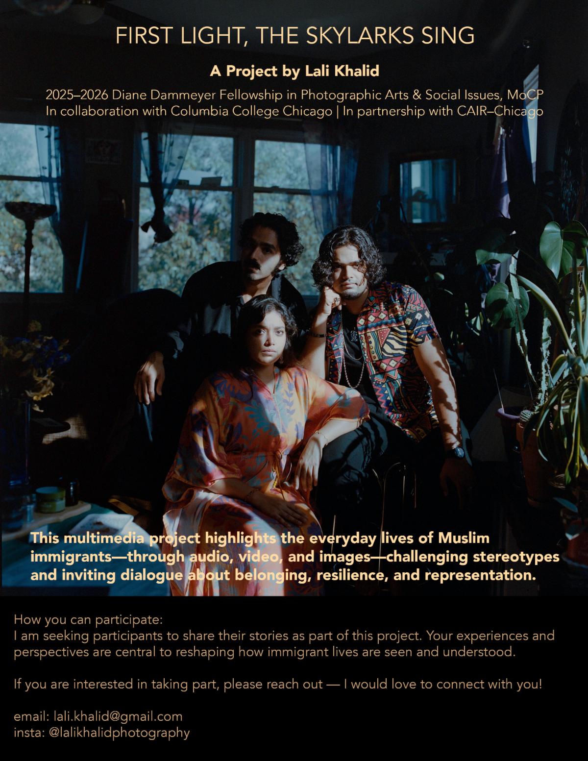 "First Light, The Skylarks Sing" is a multimedia portrait project exploring the lived experiences of Muslim immigrants in the Chicagoland area. Through photography, audio, video, and narrative text, the project documents the emotional, social, and cultural complexities of immigration—focusing on themes of identity, belonging, resilience, and representation.
