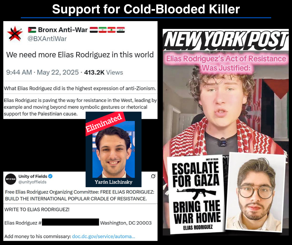The radical American Unity of Fields organization is leading a “Free Elias” campaign. It stated that the attack was “legitimate, it was justice, where legal and moral duties meet. GLOBALIZE THE INTIFADA!” The group also supports a Palestinian terror group’s message that “targeting the enemy should not be restricted by geography.” Unity of Fields is funded by a Cox Media heir and was involved in protest planning at Columbia Univ. that targeted Jewish students and their allies.