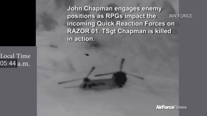 in 2016, tells a different story. The low-quality drone footage showed one man in a bunker defending himself against two others, eventually killing one with a rifle shot. The Predator feed was later paired with video taken from the C-130, offering a clearer picture of what happened. It showed that Chapman continued to fight, even after being left for dead. As the Times reported, briefing slides prepared by the Air Force said that Chapman was unconscious at the time Slab believed him dead. Minutes after the SEALs moved down the mountain, Chapman came to and crawled into the bunker at around 5:25 a.m., where he sought cover. At 6 a.m., fighters fired a rocket-propelled grenade toward him as another rushed the bunker, which Chapman dispatched with a rifle shot.