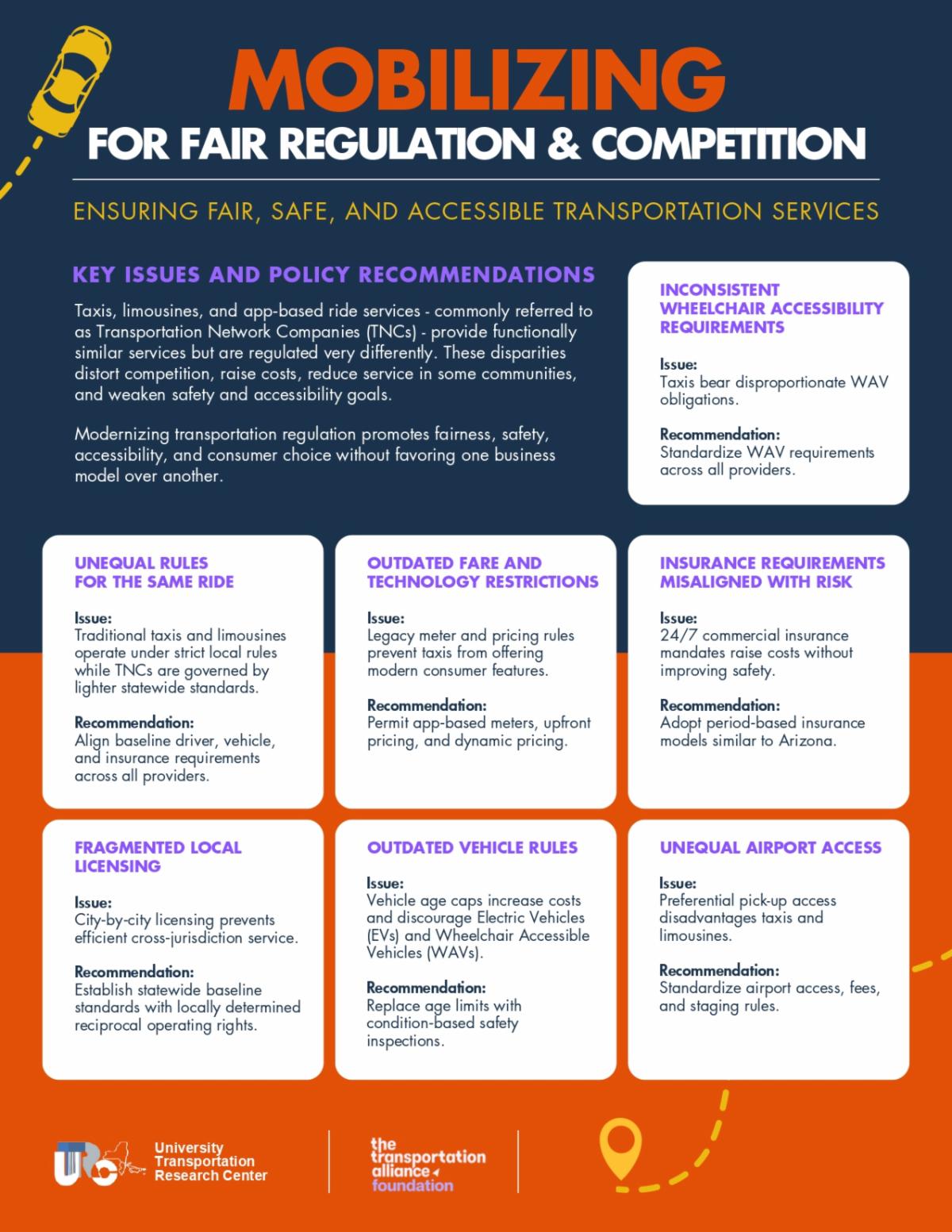 A new report, Mobilizing for Fair Regulation & Competition with Transportation Network Companies (TNCs), prepared for The Transportation Alliance Foundation in collaboration with the University Transportation Research Center (UTRC), explores how technological innovation and evolving consumer expectations have reshaped the for-hire vehicle market while exposing significant regulatory imbalances between traditional providers and TNCs.