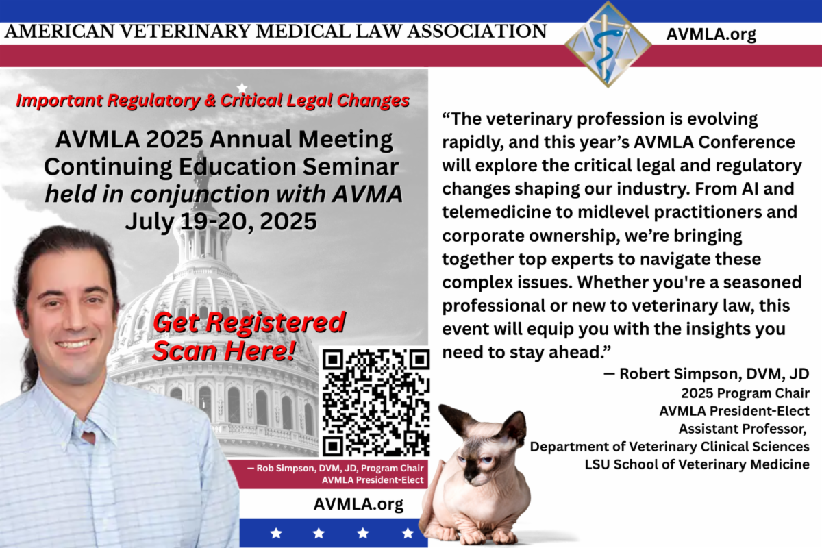 Join Robert Simpson, DVM, JD—AVMLA President-Elect and 2025 Program Chair—for the 31st AVMLA Annual Continuing Education Conference, July 19–20, 2025, in Washington, D.C., held in conjunction with the AVMA Convention.