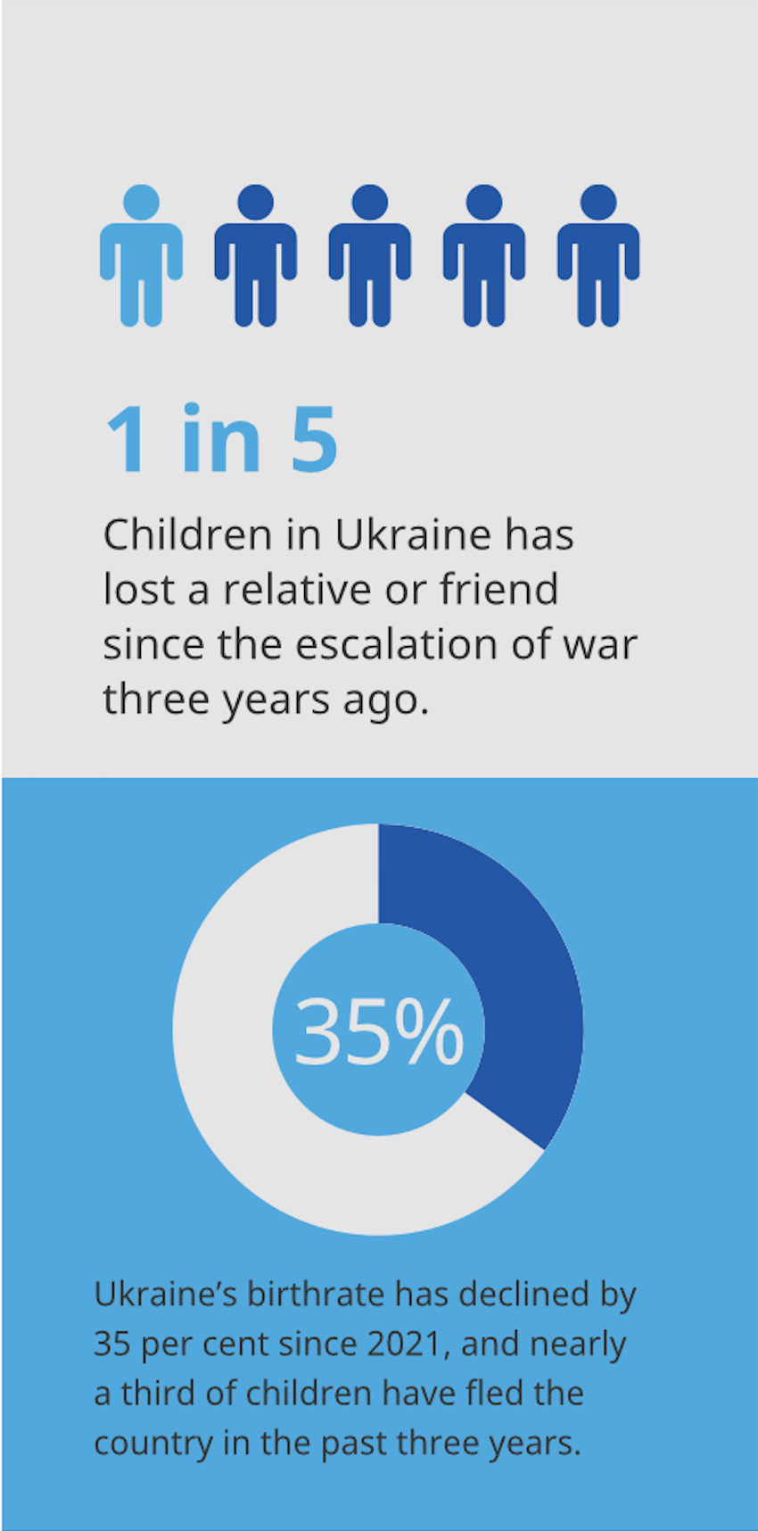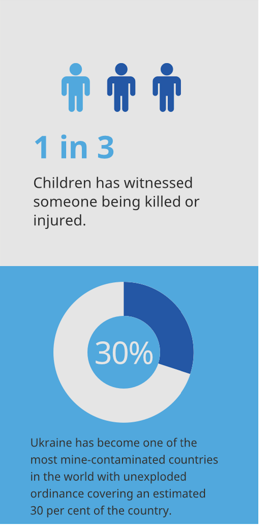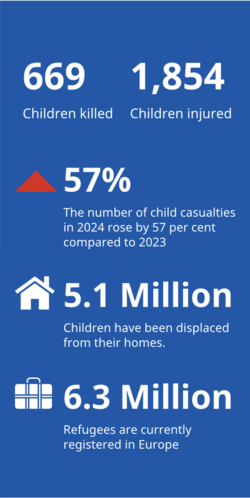 For most children in Ukraine, especially those living in eastern Ukraine, their lives were marked by bombardment, violence, and displacement. More than 2,520 children have been killed or injured since February 2022 (numbers verified by the UN), even though the true number is likely higher. Russia has forcefully transferred over 35,000 Ukrainian children (Yale’s Humanitarian Research Lab Data) to Russia to wipe the children’s memories, identity, including their families, nationality, and life before the occupation. Over 5.1 million children have been displaced from their homes and 1 in 3 children has witnessed someone being killed or injured (Unicef report).
