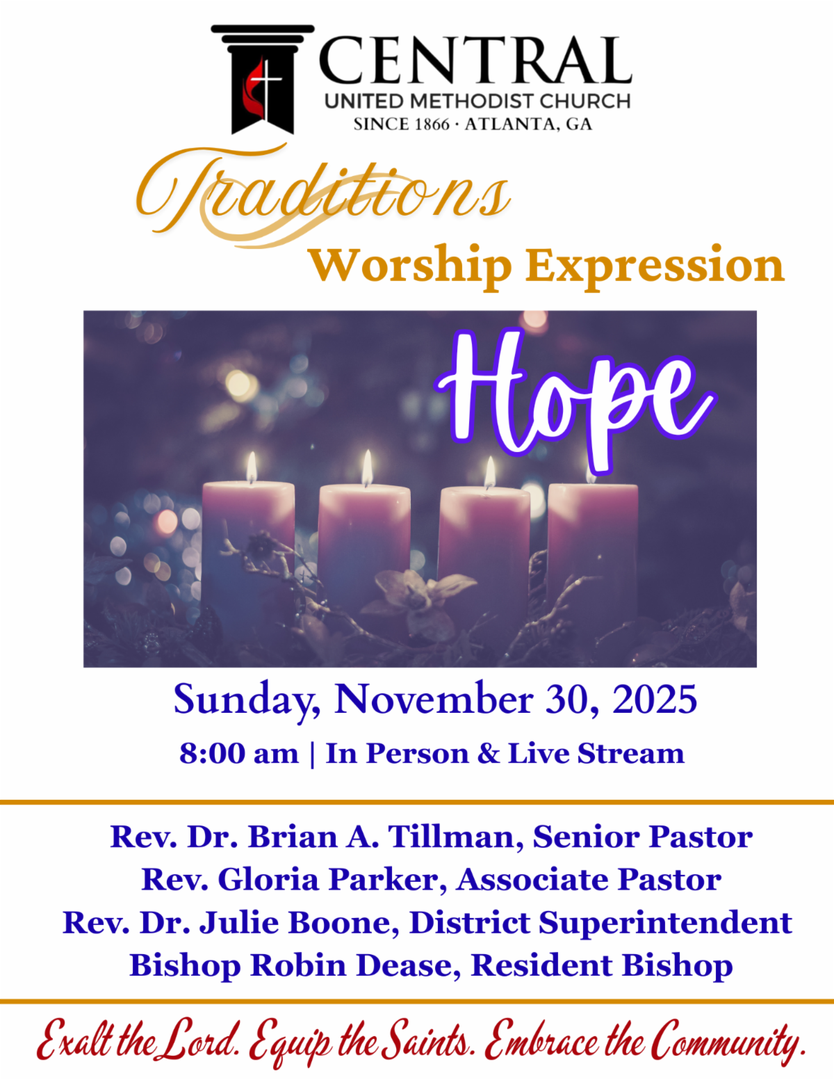 TRADITIONS Worship Experience, 8:00am (Sanctuary) |Continental Fellowship Breakfast, 9:15am (Fellowship Hall) | Advent Sunday School Classes, 9:30am (MEC, Youth Rm., Garden Rm., Virtual ) | CENTERED Worship Experience, 11:00am (Sanctuary)