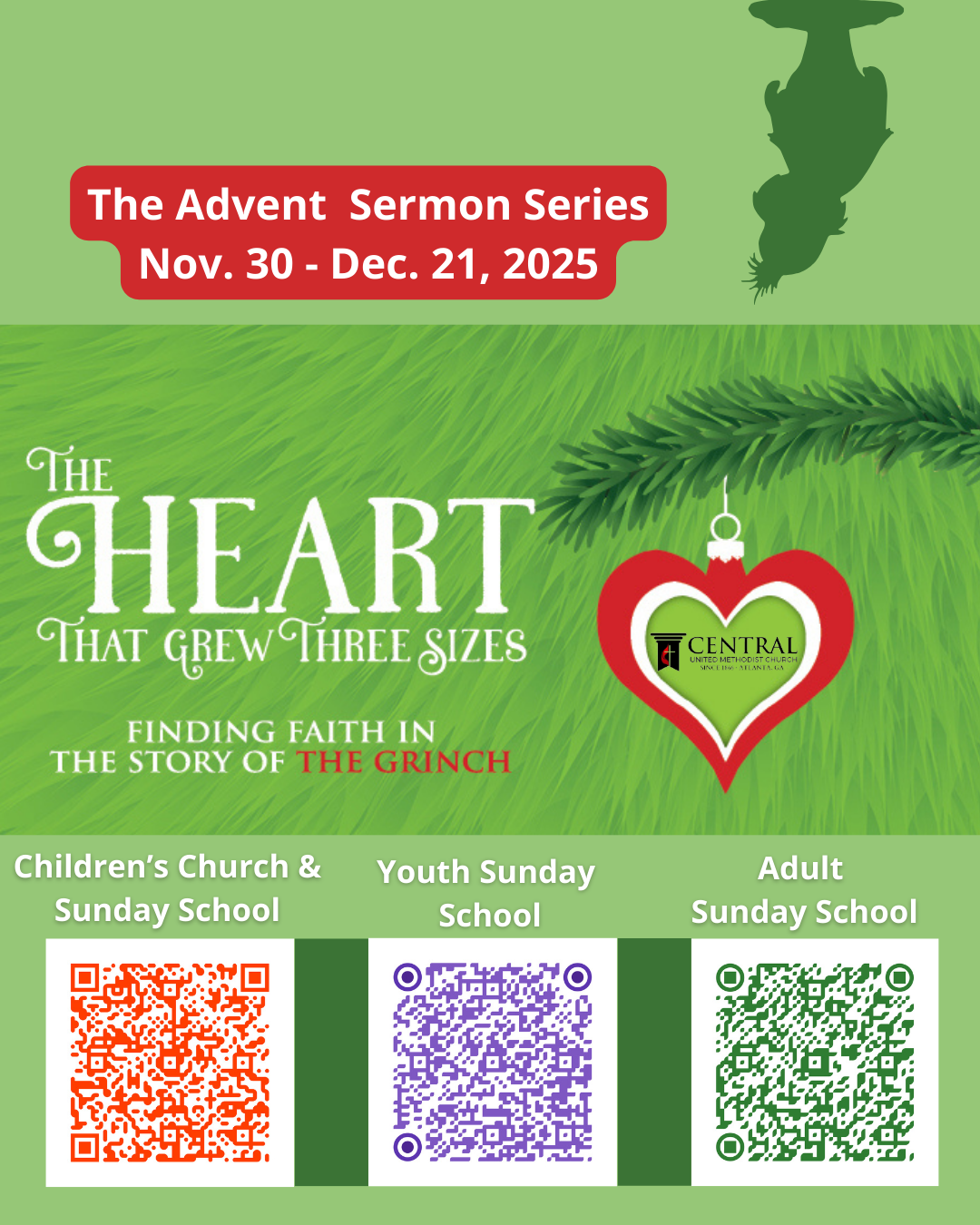 Advent Sermon Series, "The Heart That Grew Three Sizes; Find Faith in the Story of the Grinch" starts Sunday, November 30th during the TRADITIONS and CENTERED Worship Experiences.