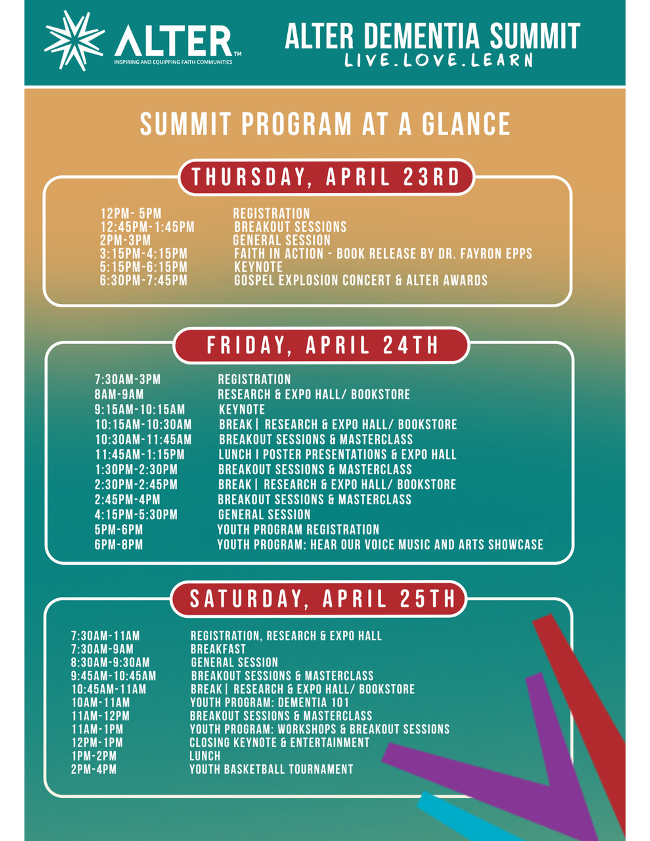 - The Alter Dementia Summit will feature informative and inspiring speakers, networking opportunities, and exciting entertainment, and we’d love to see you there! Please invite a fellow parishioner, congregant, family member, friend or neighbor.