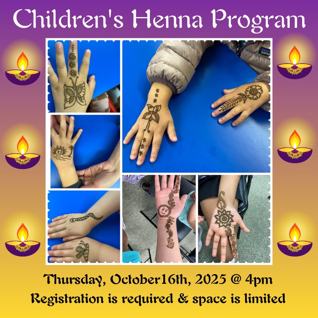 Children ages 5-10 are invited to come and have beautiful henna patterns drawn on their hands! Henna is a plant based natural dye. It’s made out of dried leaves. Leaves are ground into a fine powder then mixed with essential eucalyptus oil and water to make a paste which is applied with the help of cones to make beautiful patterns. The finished pattern has a rich brown color upon drying and stays well for 7-10 days!