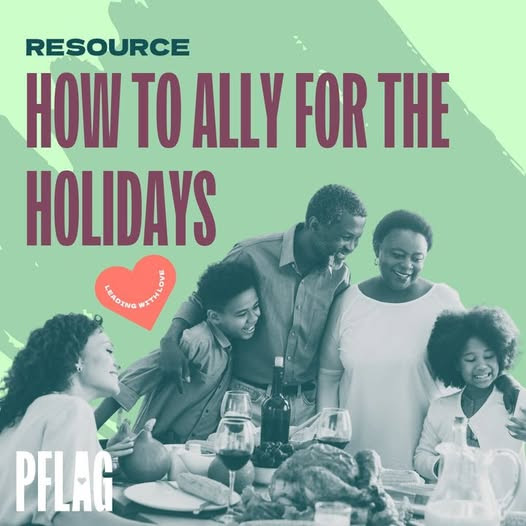 PFLAG National’s Straight for Equality program, and Your Trans Cousin on Substack, have some great resources for how to navigate family gatherings and be a visible, vocal, and active ally to the LGBTQ+ people in your life this holiday season. Click the links below: