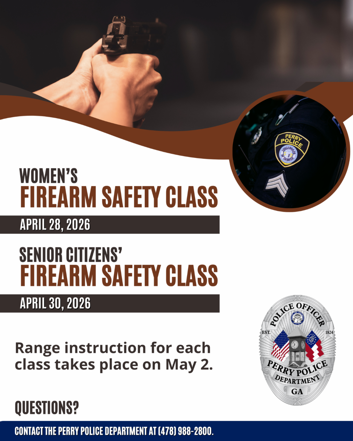 The Perry Police Department is offering 2 free firearm safety classes this April for women and senior citizens. These classes provide hands-on instruction in handgun safety, including proper loading, unloading, firing, and an overview of Georgia firearm laws.