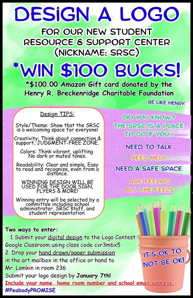 The new Higgins Student Resource & Support Center (SRSC) needs a logo, so we launched a contest open to all Higgins students to design it for a chance to win $100.00 Amazon gift card. Posters have been hung around the school that incudes design tips.