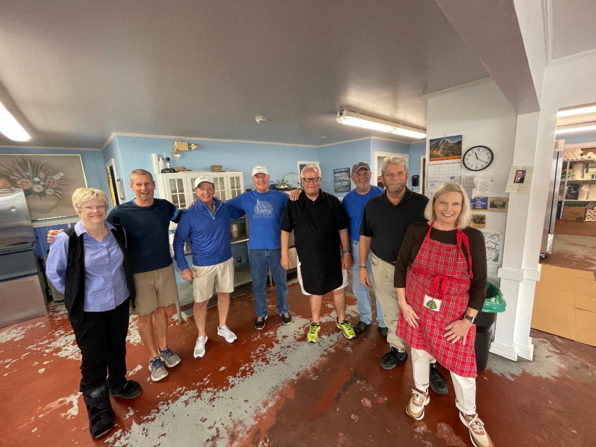 Faithful Manna House crew serving neighbors in Christ the first Monday of every month. (Left to Right: Martha Martin, Doug Tingle, Philip Saussy, Matt Hodgdon, Joe Wills, Ron Townsend, David Keen & Ginny Connors.)