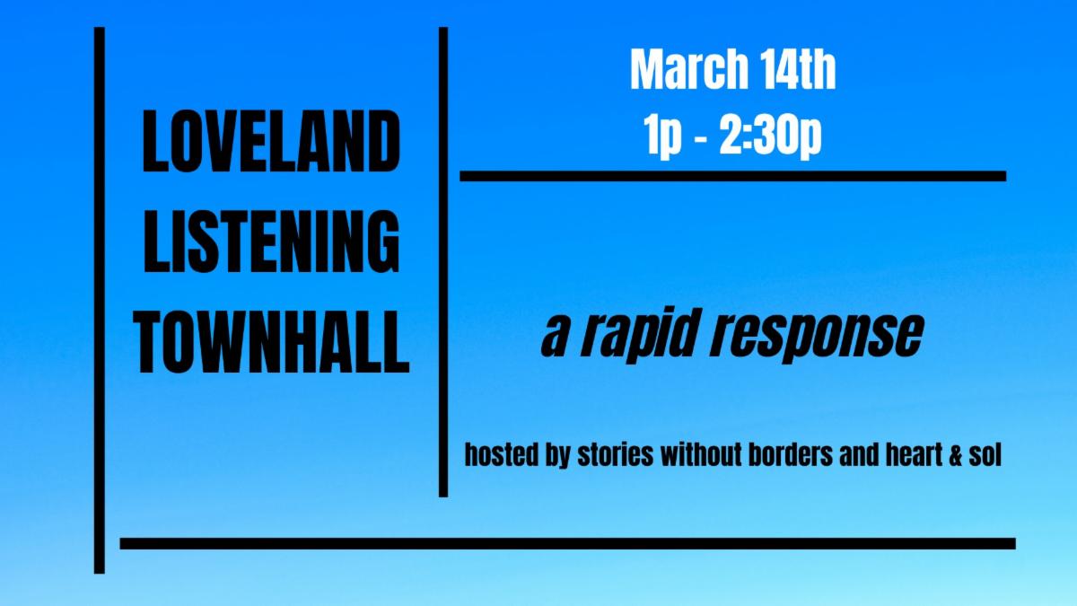 Stories Without Borders, in partnership with Heart & Sol of Loveland, will be hosting the next Listening Session this Sunday, March 14th, in rapid response to the most recent City Council study session with The Gemini Group.