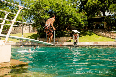 Visitors are encouraged to create Barton Springs-inspired poetry on the magnetized Susan Bright memorial tree, leave a love note for Barton Springs, and pose for a selfie with a life-sized vintage swimmer cut-out.