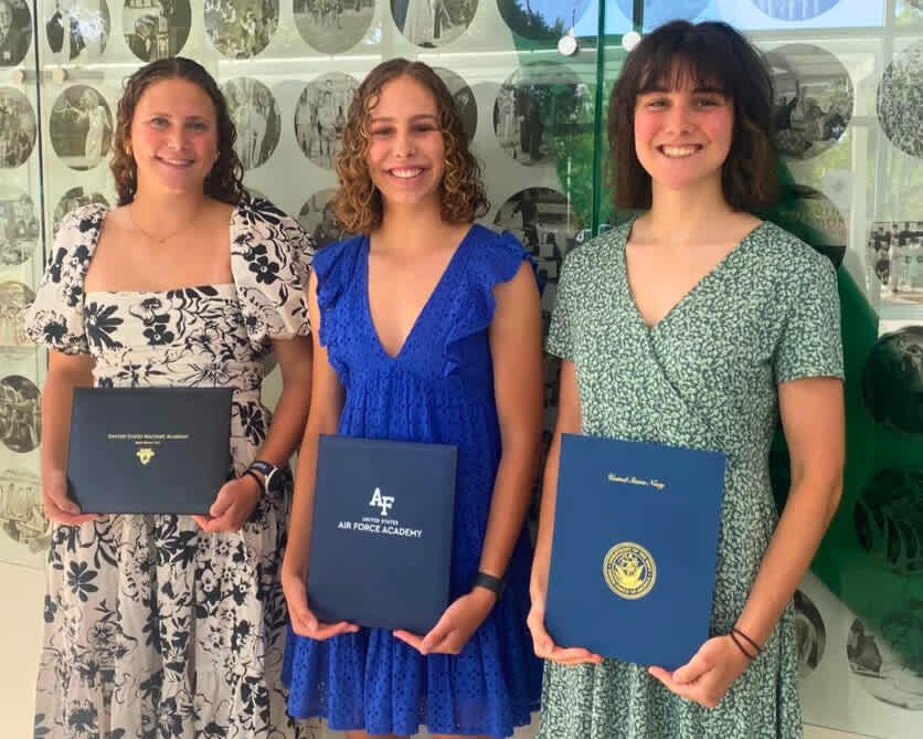 (pictured left to right) Riley “Rocky” Phelps '25 (United States Military Academy at West Point), Peyton LaNasa '24 (United States Air Force Academy), and Claire Steinbach '25 (Navy ROTC, Carnegie Mellon University).