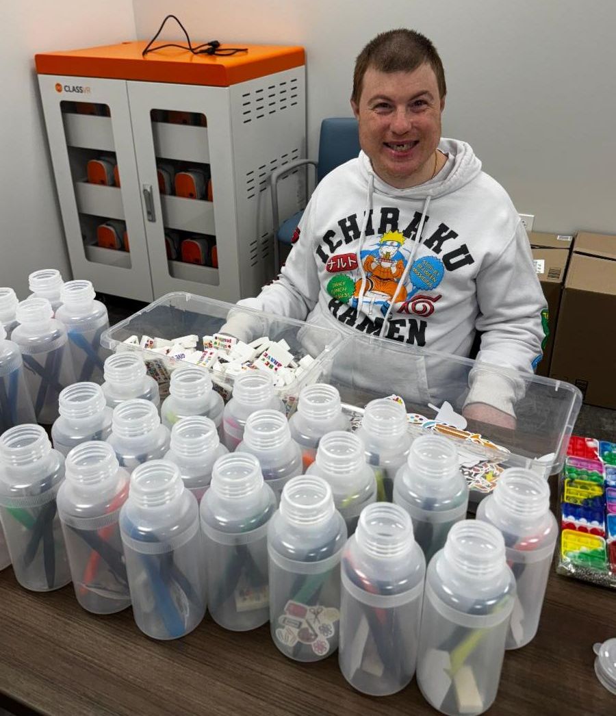 The project included assembling 800 water bottles stuffed with school items—and our individuals jumped right in with enthusiasm! The speed and teamwork they showed was inspiring. Many expressed how proud they felt knowing that their work would help other children start the school year prepared and supported.