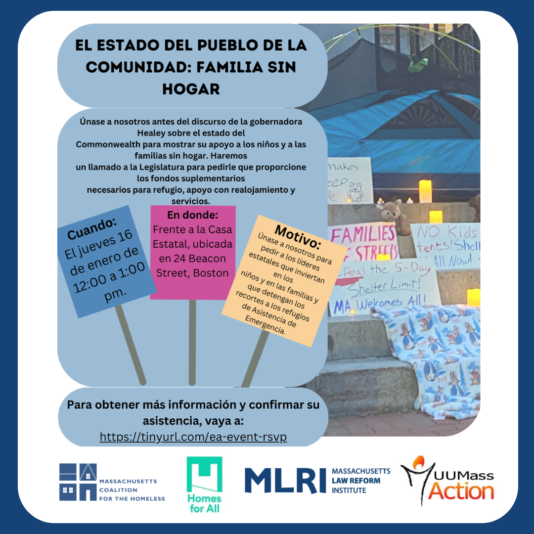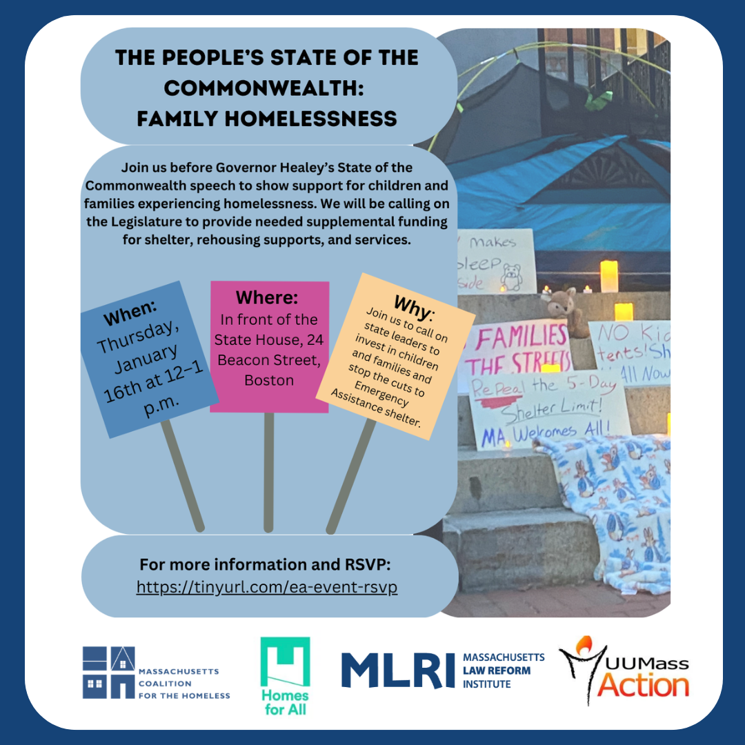 Please join the Massachusetts Coalition for the Homeless, Massachusetts Law Reform Institute, Homes for All Massachusetts, UU Mass Action, City Life/Vida Urbana, Lynn United for Change, Greater Boston Legal Services, and other allied organizations this Thursday, January 16th for our "The People's State of the Commonwealth: A Spotlight on Family Homelessness" event. We will have an in-person action at the State House and a call-in day. We will highlight the impacts of current limits and restrictions on access to Emergency Assistance (EA) shelter and ask the Legislature to fully fund Emergency Assistance, reject further punitive family homelessness policies, and invest more in rehousing and homelessness prevention. Keep reading for more details on our requests.