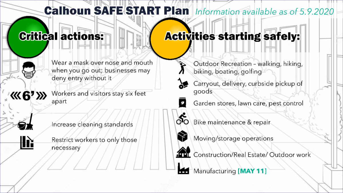As businesses begin to reopen, it is critical for everyone across Calhoun County to continue following the guidance from the Centers for Disease Control and Prevention, as we remain in an active pandemic. Doing otherwise could create a second wave of positive COVID-19 cases.