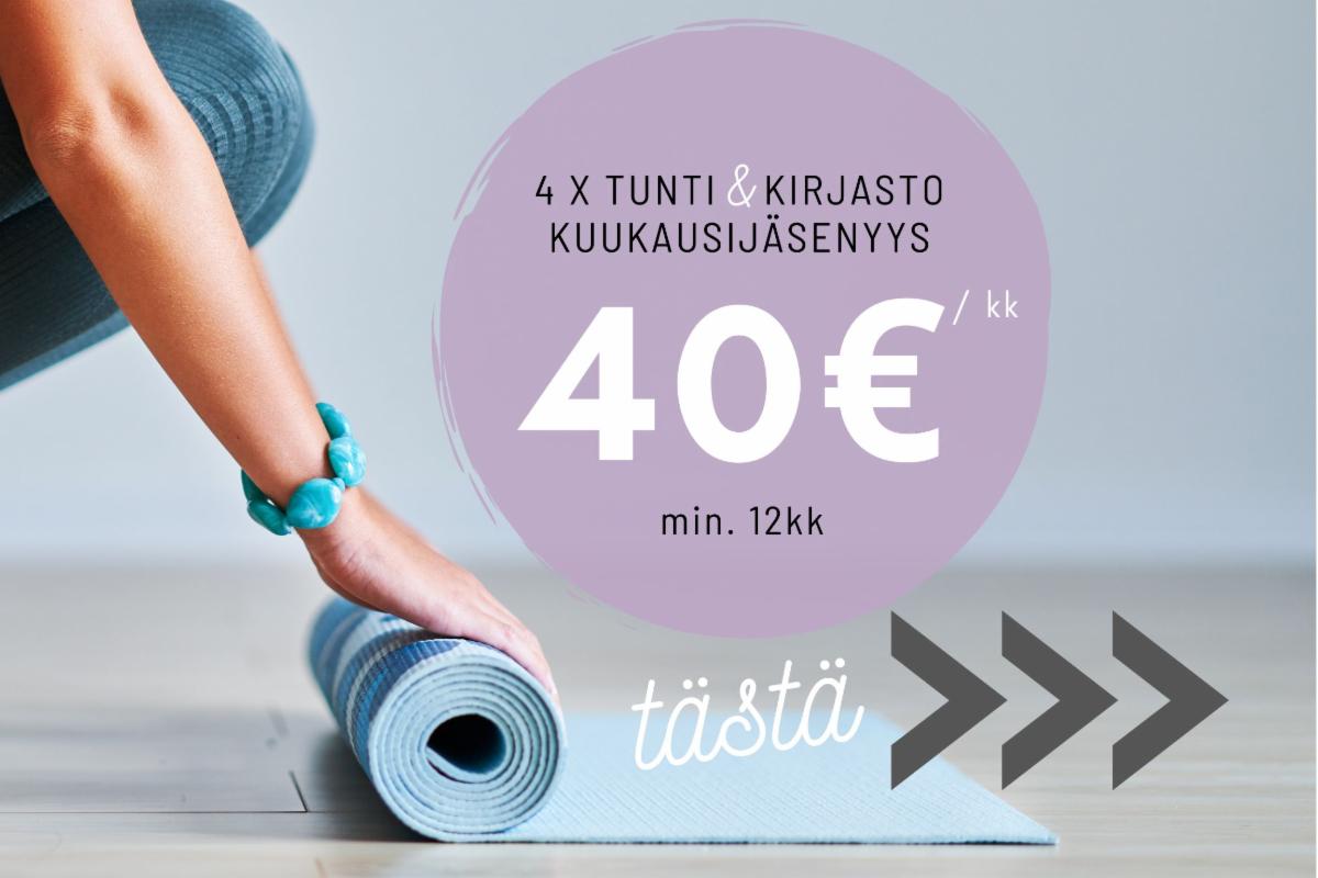 Tutustu nyt uuteen tapaan joogata meillä: kuukausimaksuinen jäsenyys, joka sisältää 4 valitsemaasi tuntia ja tallennekirjaston. Vaivattomasti 40€ kuukausihintaan.