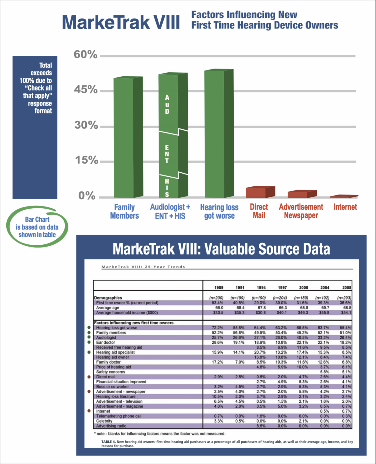 | | Being staunchly aligned with reputable research (not hocus pocus), we hearken back to MarkeTrak VIII, the 1st study brought to our attention in 2008, featuring this headline: | | Among noteworthy findings were Factors influencing new first-time, new hearing device owners. As the chart below shows, almost 50% of individuals reported being influenced by family members, motivating loved ones to seek sound advice on prescribed treatment options. See source data for detailed review, and realize that 17 years later, Friends & Family referrals remain a primary factor in stimulating practice growth. | | | |