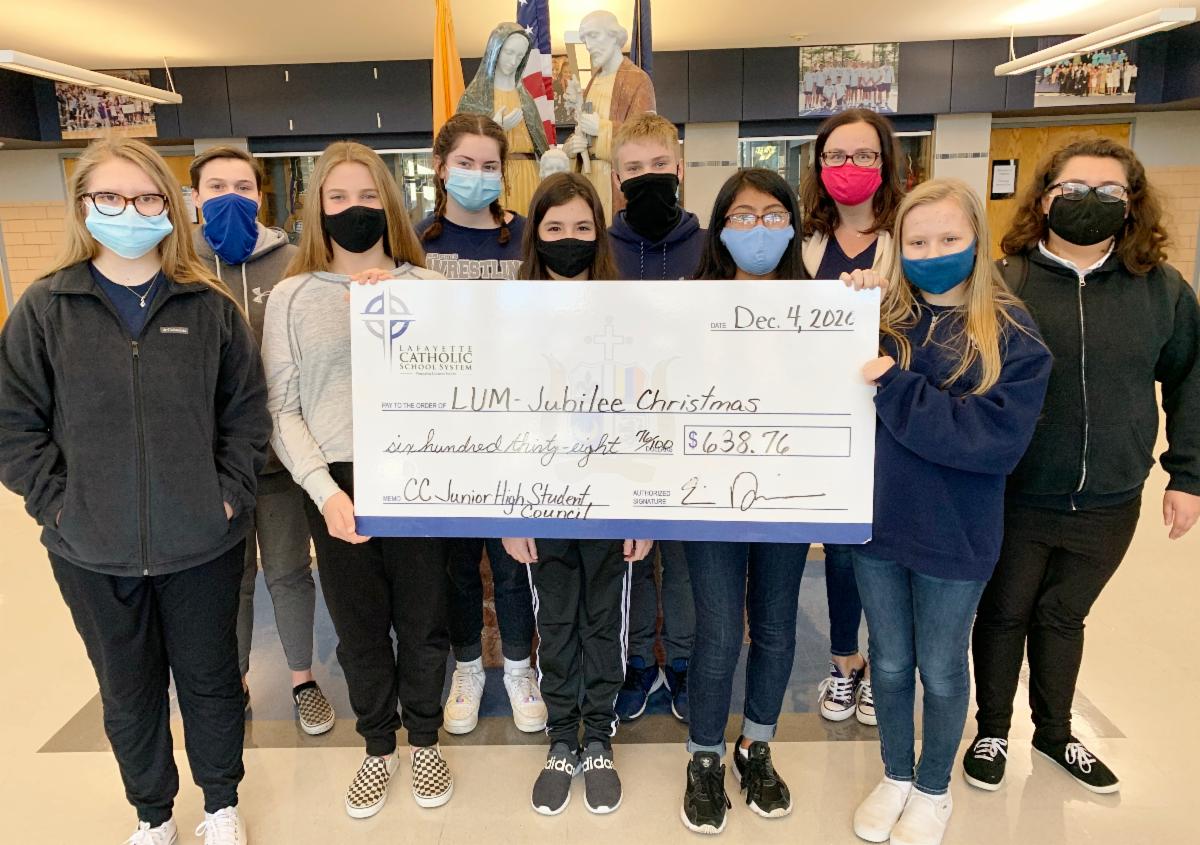 The Central Catholic Junior High Student Council sponsored a "Spirit Day" fundraiser (students pay to not wear their uniforms) and chose LUM & Jubilee Christmas as the recipient. They raised $638.76, which will be used to assist the Jubilee Christmas events at the Catholic churches — the Church of the Blessed Sacrament, St. Lawrence, St. Mary Cathedral, and St. Thomas Aquinas. The student council members are also baking cookies for the Jubilee Christmas families at St. Thomas Aquinas. Please join us in thanking these junior high school student leaders for their generosity and commitment to helping others.