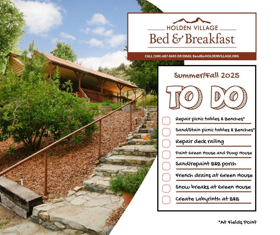 You can also help by providing key items for the B&B and Fields Point. Check the wishlist at the link below for a list of tasks and needed item. Contact Roberta at downlake@holdenvillage.org to coordinate dates and availability, and with any questions.