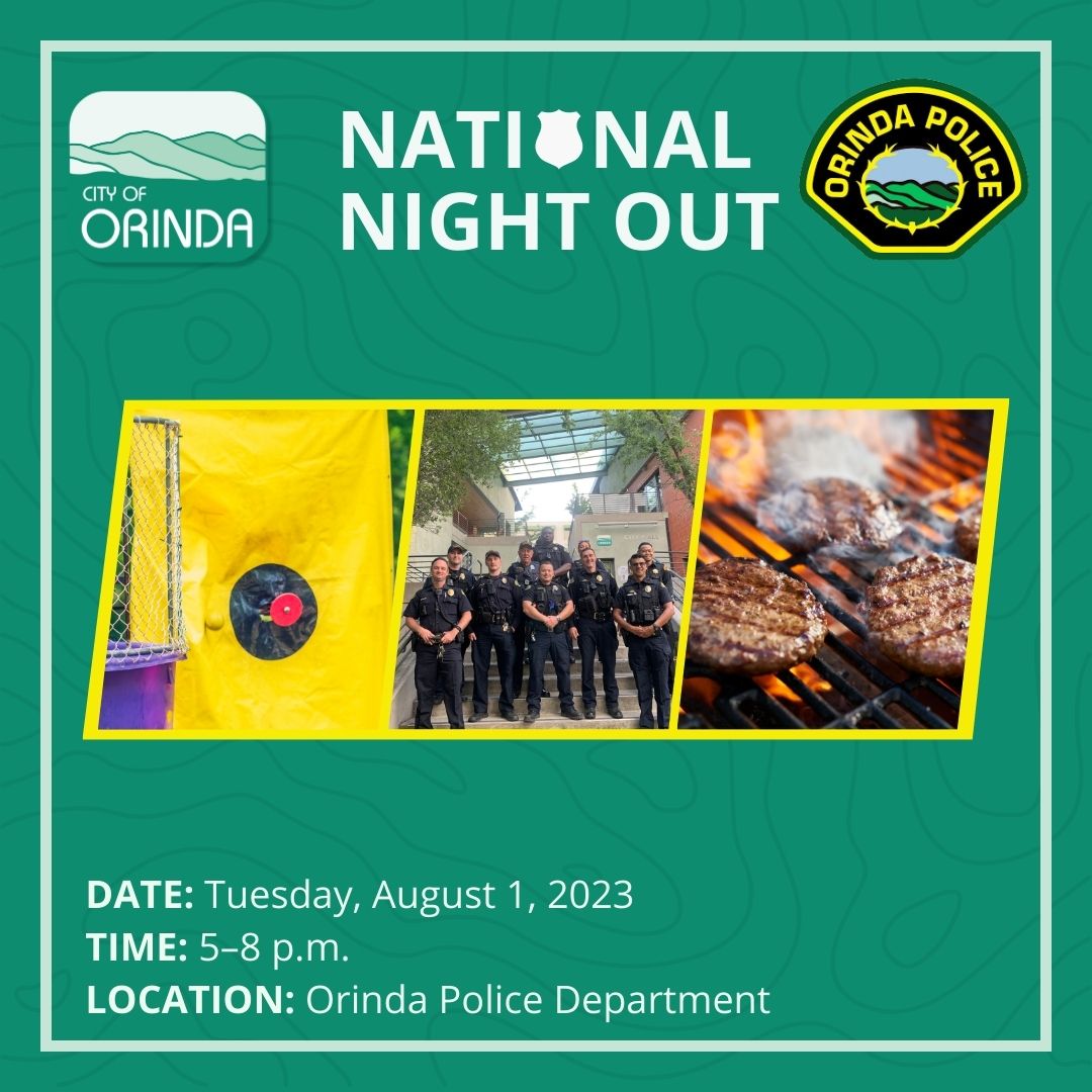 Orinda Police Department is hosting the annual National Night Out event at the Police station on Tuesday, August 1, from 5:00 p.m. to 8:00 p.m. Meet your neighbors, learn how to help fight crime, and have fun!