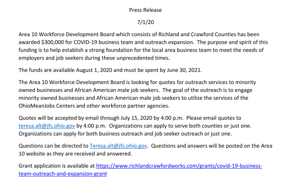 - The Chamber office will be open from 9am- 4pm Monday thru Friday or by appointment during the month of July. Please call 419-468-7737 to make an appointment.