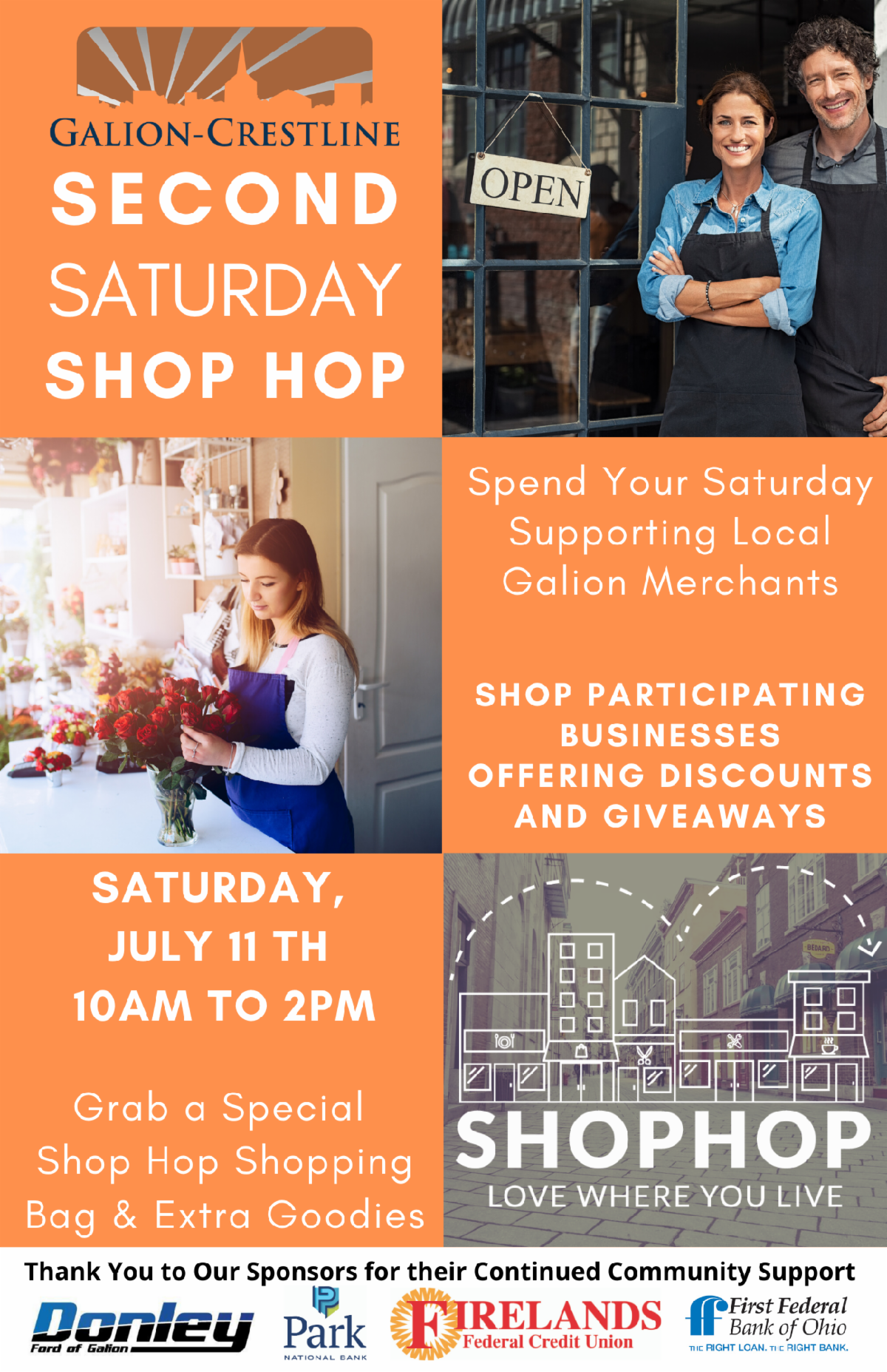 - We will be holding our second Second Saturday Shop Hop from 10am - 2pm on July 11 in Galion to bring people to downtown businesses. We are also running a Galion Food and Beverage Blitz for local Galion Chamber businesses. We look forward to bringing both of these programs to Crestline in the near future.