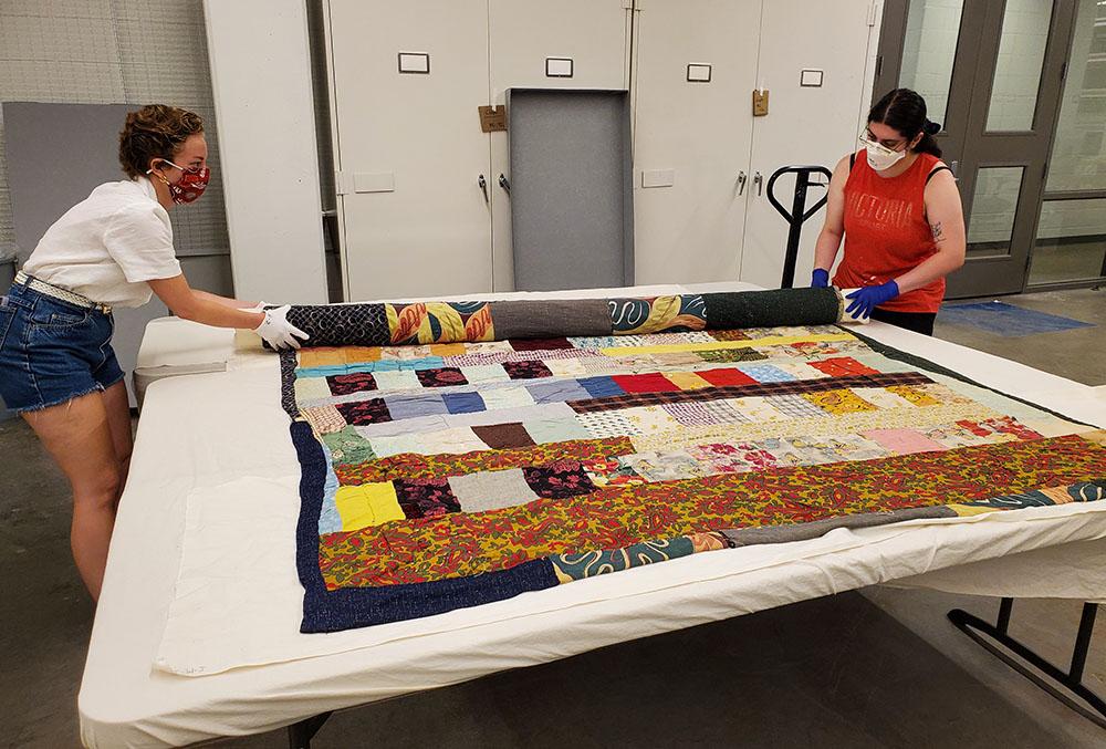 As IUMAA moves in more artifacts, and more exhibits are being designed and built, students are playing a critical role in every aspect of the work.Caroline Goodwin and Anne Marie McCarthy, seen left carefully rolling up one of the museum's Gullah quilts for storage, are among the many interns, practica students, research fellows, and graduate assistants helping to prepare for the museum's opening in Fall 2023.