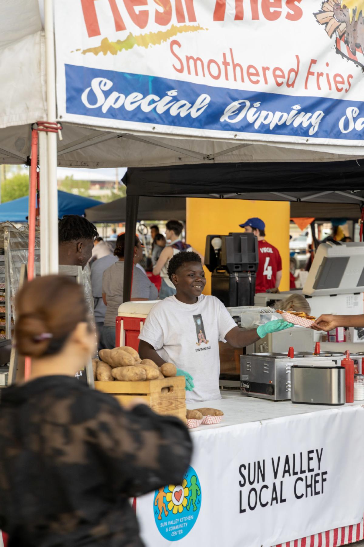 At the last marketplace in May, the Night Market featured five local chefs, that used Sun Valley Kitchen + Community Center's commercial kitchen as a commissary kitchen. The photos above spotlight Tra Nguyen, a Sun Valley chef, serving food at her booth. Additionally, Odie Tina, a Sun Valley youth, helped out at Glenn's Fry Stand.