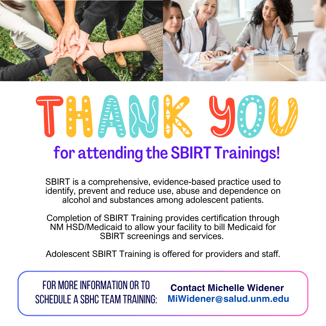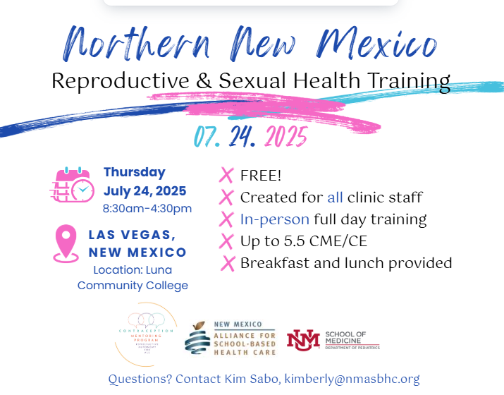We recognize that the end of the school year is often busy. As you plan for professional development days before school starts and would like to schedule a training for your SBHC team, please contact Michelle Widener at MiWidener@salud.unm.edu.
