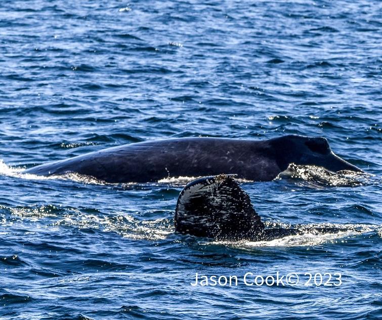 15:45 - 15:55, humpback BCY0946 "Slits" traveling up island (northbound) 400' from shore. The whale quickly headed due west away from shore surfacing many times. Their behavior was interesting; once rolling over to expose their ventral slits (stunning!), once just wagging the tip of a pectoral fin out of the water and a few times exhaling without lifting more than their rostrum out of the water. I wish she/he would have lingered. Interestingly, Erin Johns Gless told me that this is the humpback entangled and set free by DFO in October 2022. Erin included a link to a drone video of the rescue. Many thanks to the rescue team! Thank you Erin for the information.