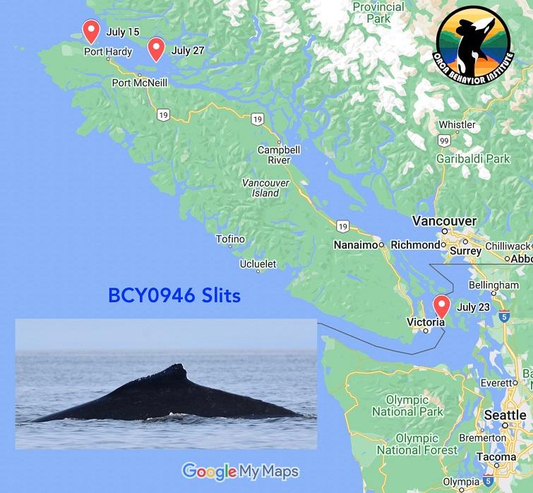 Note about BCY0946 Slits: Slits was reported solo bubble-net feeding on the west side of San Juan Island on July 23. On July 27, Slits was spotted by Port McNeil! That means s/he traveled about 260 miles in 3.5 days!
