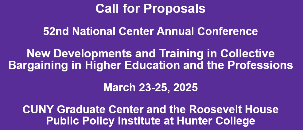 The National Center has issued a Call for Proposals for our 52nd annual conference that will take place on March 23-25, 2025 in New York City. The theme of the conference will be New Developments and Training in Collective Bargaining in Higher Education and the Professions.