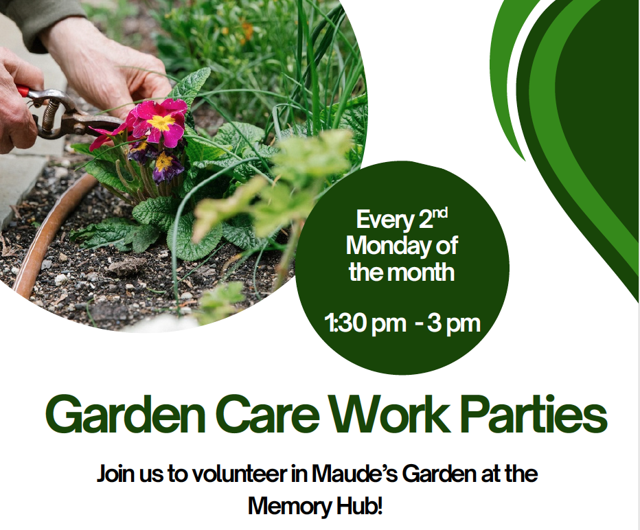 Join us to volunteer in Maude's garden care. All are welcome, with a special invitation to persons with memory loss and their families. If you need physical or cognitive support in order to participate, please bring a care partner with you. Flyer