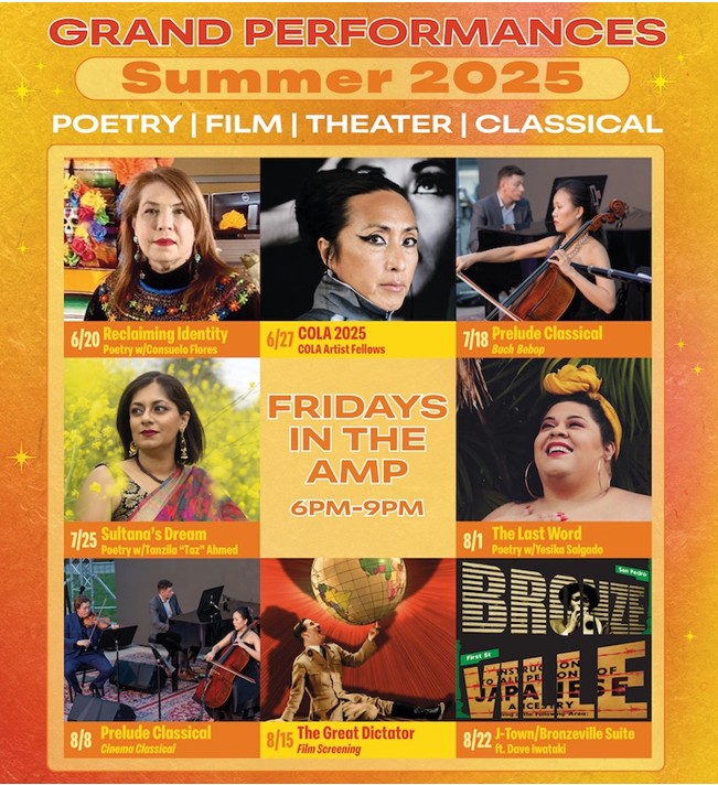 Founded in 1986, Grand Performances is the longest running presenter of free outdoor concerts, poetry, theater and dance in downtown Los Angeles. Grand Performances' mission is to inspire community, celebrate diversity, and unite Los Angeles through free access to global performing arts. GP’s summer concert series has featured Stevie Wonder, Ozomatli, Seun Kuti, Ana Tijoux, Aloe Blacc, Angelique Kidjo, Vieux Farka Touré, Chucho Valdes and more. Seating is open and filled on a first come, first-served basis. Disabled seating is available on the Lower Plaza.