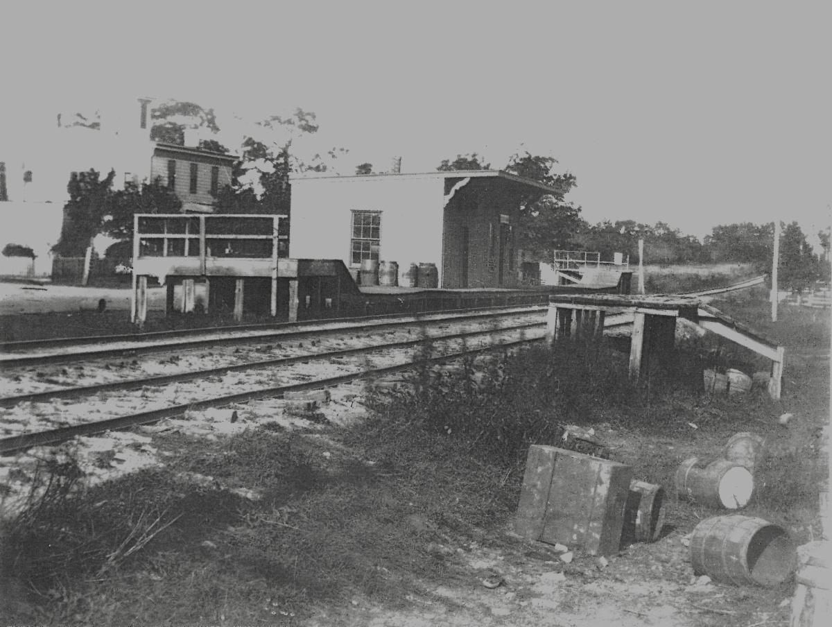 "The station was designated "Centerport" at the time of this photo. Notice the barrels scattered about the depot as an indication of the LIRR's freight business, which produced more revenue than passengers at this time."