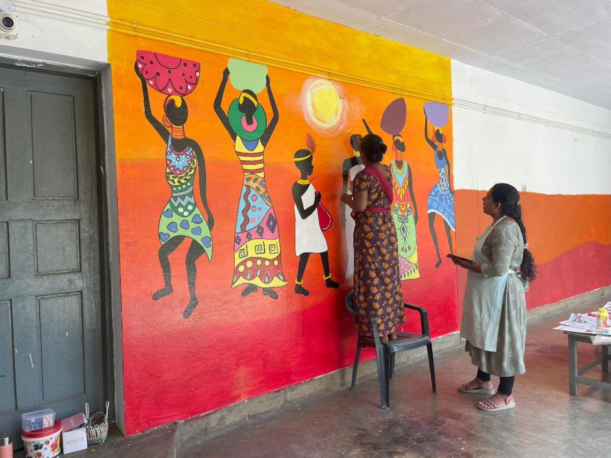 Pictured Above: A ninth grader at Melpattampakkam Boarding Home in Tamil Nadu, India, helps paint a new mural while her art teacher, Fatima Mary, provides guidance. She is one of 15 students assisting with the project. This is one of many projects underway at the boarding homes this summer. | |