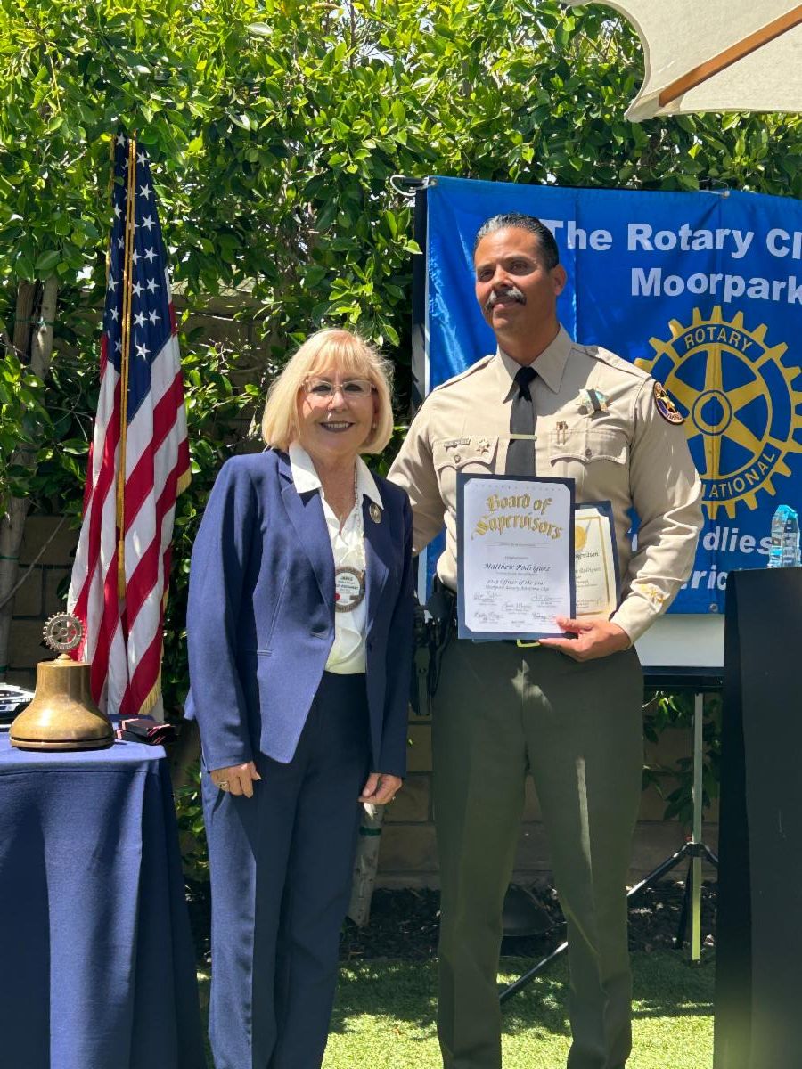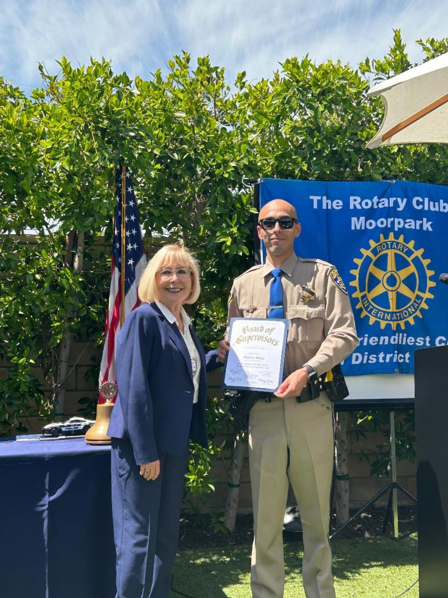 | I attended the impressive CA-20142 AFJROTC annual Pass-In-Review event at Royal High School. The cadets demonstrated qualities that reflect the strength of this incredible program. Although it was a challenge to be a judge, a special congratulations to Bravo Flight for winning both the Jody Competition and the title of Flight of the Year, a remarkable achievement! I also want to extend congratulations to all the seniors who participated in their final review. I’m excited to see what your futures hold. | | | Moorpark Rotary Officer of the Year Awards | Moorpark Rotary recognized CHP Officer Marco Mejia and Ventura County Sheriff’s Deputy Matthew Rodriguez as the 2024 Officers of the Year. These outstanding individuals were celebrated for their unwavering commitment to public safety, professionalism, and service to our community. Their dedication does not go unnoticed, and we are grateful for the work they do every day to keep Ventura County safe. | | | | |