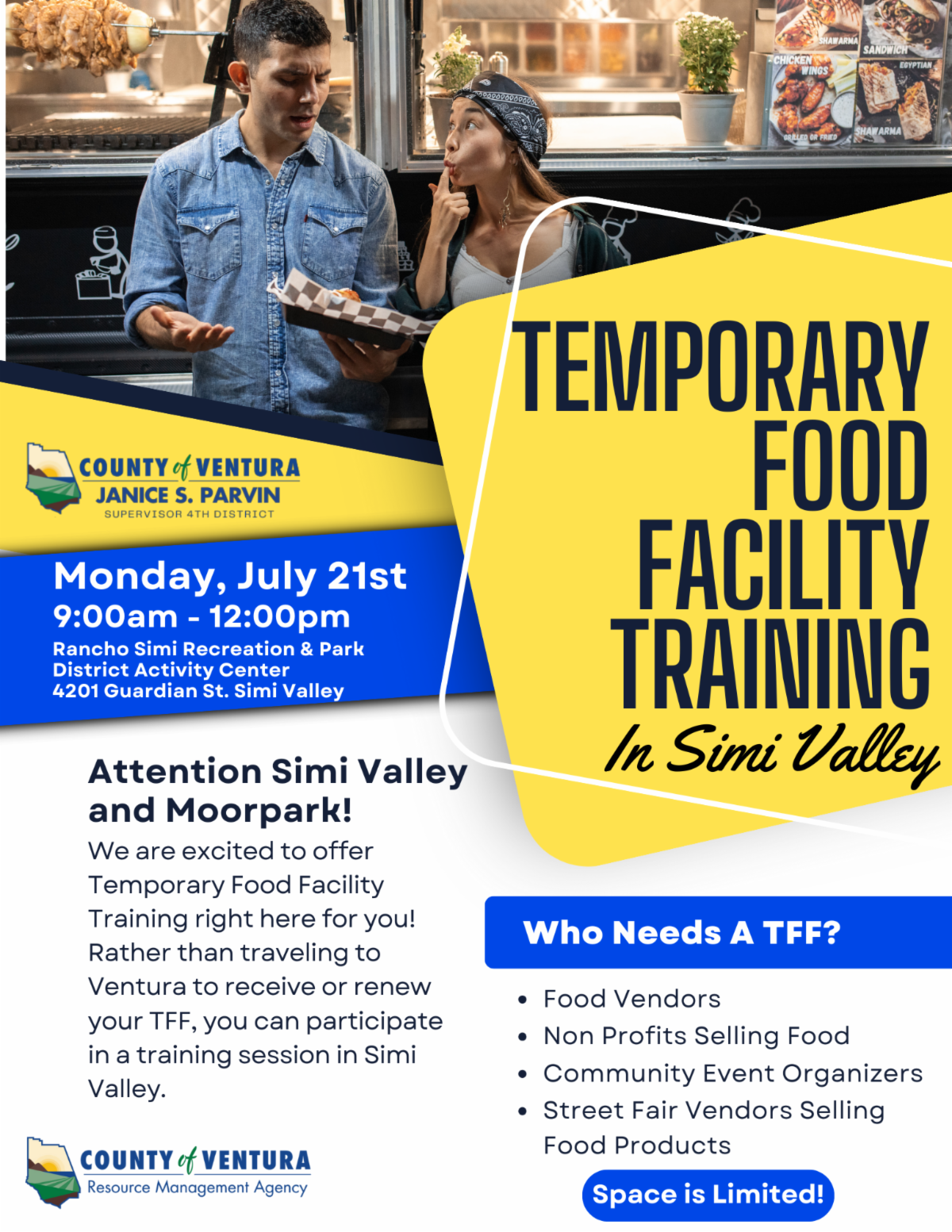 | | | Temporary Food Facility Training in Simi Valley | We’re excited to bring Temporary Food Facility (TFF) Training back to Simi Valley for a second time! If you’re a food vendor, nonprofit selling food, or organizing a community event, this is your chance to receive or renew your TFF certification without traveling to Ventura. Join us on Monday, July 21st from 9:00 AM to 12:00 PM at the Rancho Simi Park & Rec District Activity Center (4201 Guardian St.). Space is limited, so don’t wait. | | | | | |