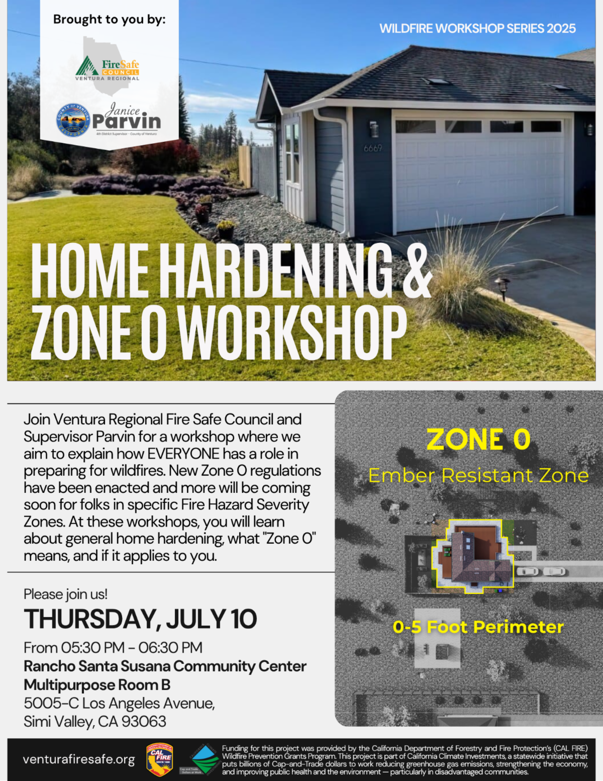 This free, in‑person session is part of our 2025 Wildfire Workshop Series and will explain the new “Zone 0” ember‑resistant regulations, and how they may affect properties in Fire Hazard Severity Zones, you will learn the practical steps every homeowner can take to strengthen their defenses against wildfire, ask questions, and leave ready to better protect your home and neighborhood. For full details and to RSVP, visit venturafiresafe.org.