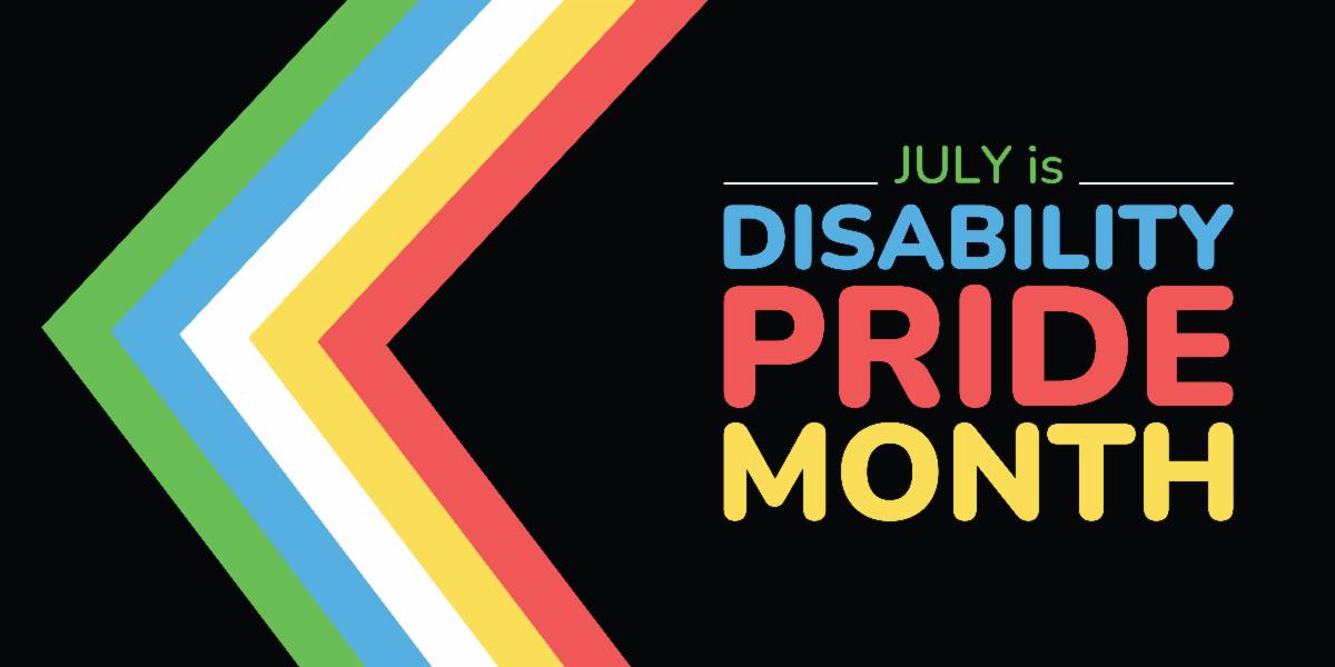 [Image description: On the right-hand side of the graphic, are the words July is Disability Pride Month. On the left-hand side is a chevron design with stripes in green, blue, white, yellow, and red.]