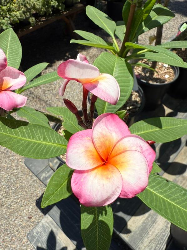 | | Plumeria has just arrived, mostly budded in many different varieties. We received a limited delivery of 5-gallon Leucospermum (Don's Red, California Sunshine, and High Gold) available for a short time. Ceanothus 'Marie Simon' is a unique hybrid with pink flowers. | | Salvia 'Danielle's Dream' is a gorgeous, light pink-flowering version of Mexican sage. Monkey flower (Mimulus, now Diplacus) is blooming nicely in various colors, as well as the butterfly favorite Echinacea (a.k.a. cone flower). The flowering plants just keep coming in! | | | |