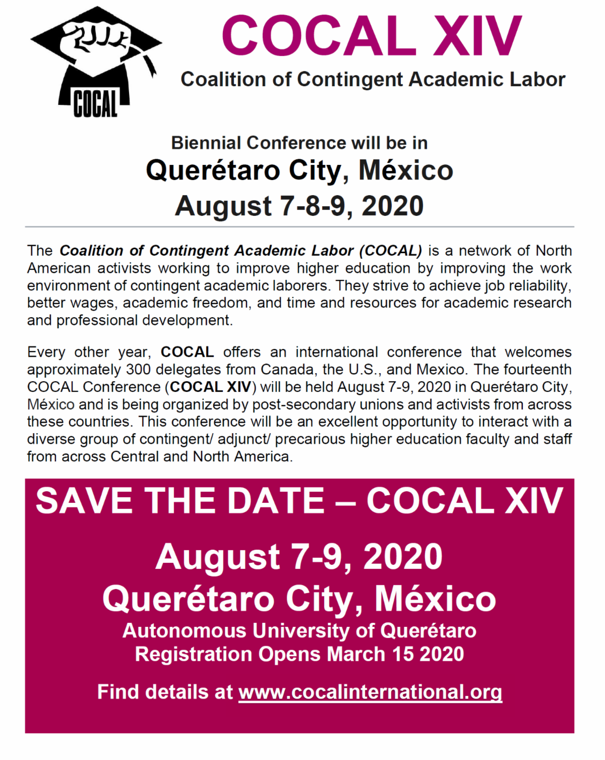 The Coalition of Contingent Academic Labor (COCAL) has postponed its 2020 biennial conference originally scheduled for August 7-9, 2020 in Queretaro City, Mexico. It is planning an online event for September.