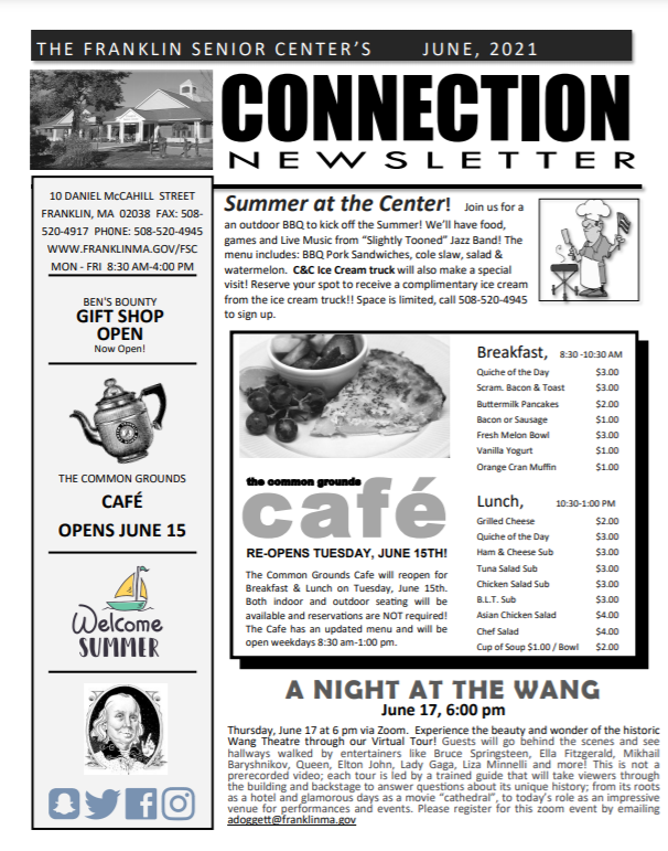 June 17 - Veterans’ Council Meeting - 7:00 p.m. at the Senior Center. Please register by emailing or calling the Veterans’ Services Office. Masks and social distancing will be required. All members of the community are welcome to join us!